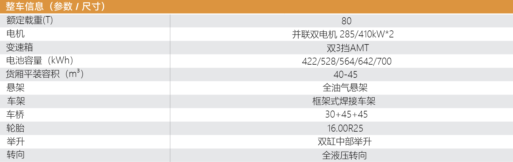 额定载重:80T 电机双电机:额定570kw峰值820kw 货厢平装容积40-45m³